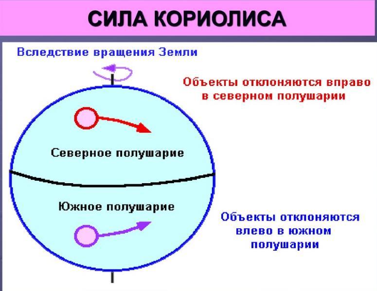 Так в Північній півкулі через сили Коріоліса всі об'єкти відхиляються вправо (праві береги річок крутіші, ніж ліві, а в Південній півкулі-навпаки, повітряні маси в Північній півкулі обертаються проти годинникової стрілки, а в Південній півкулі за годинниковою стрілкою, неоднаковий знос рейок, рух циклонів і антициклонів).