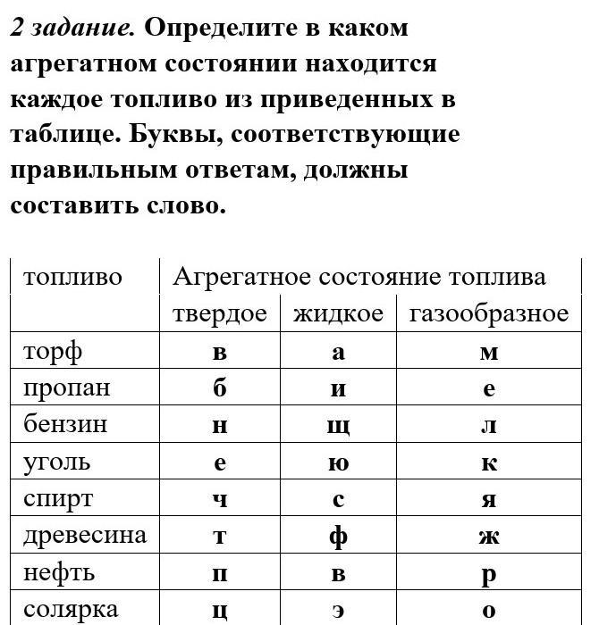 2 задание. Определите в каком агрегатном состоянии находится каждое топливо из приведенных в таблице. Буквы, соответствующие правильным ответам, должны составить слово.