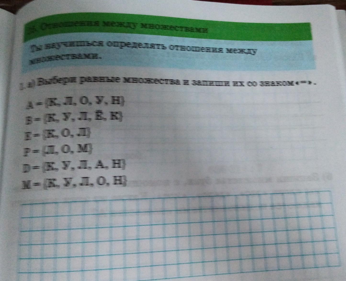 Выбери равные множества и запишите их со знаком равно А равно клоун б равно колёк е равно кол P равно D = кулан M = кулон