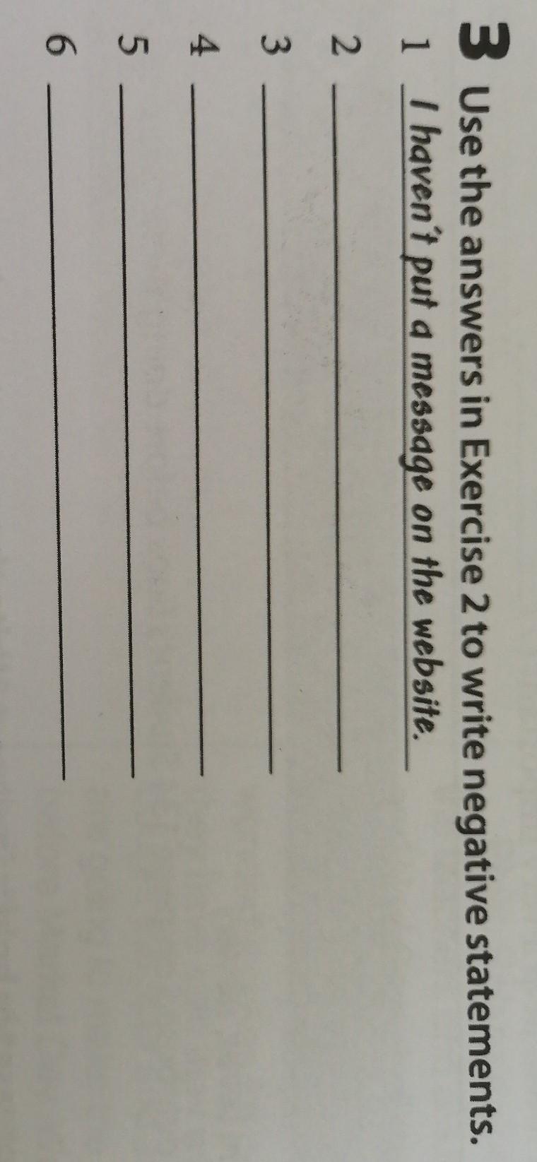 3 Use the answers in Exercise 2 to write negative statements. 1 I haven't put a message on the website. 2 3 4 5 6