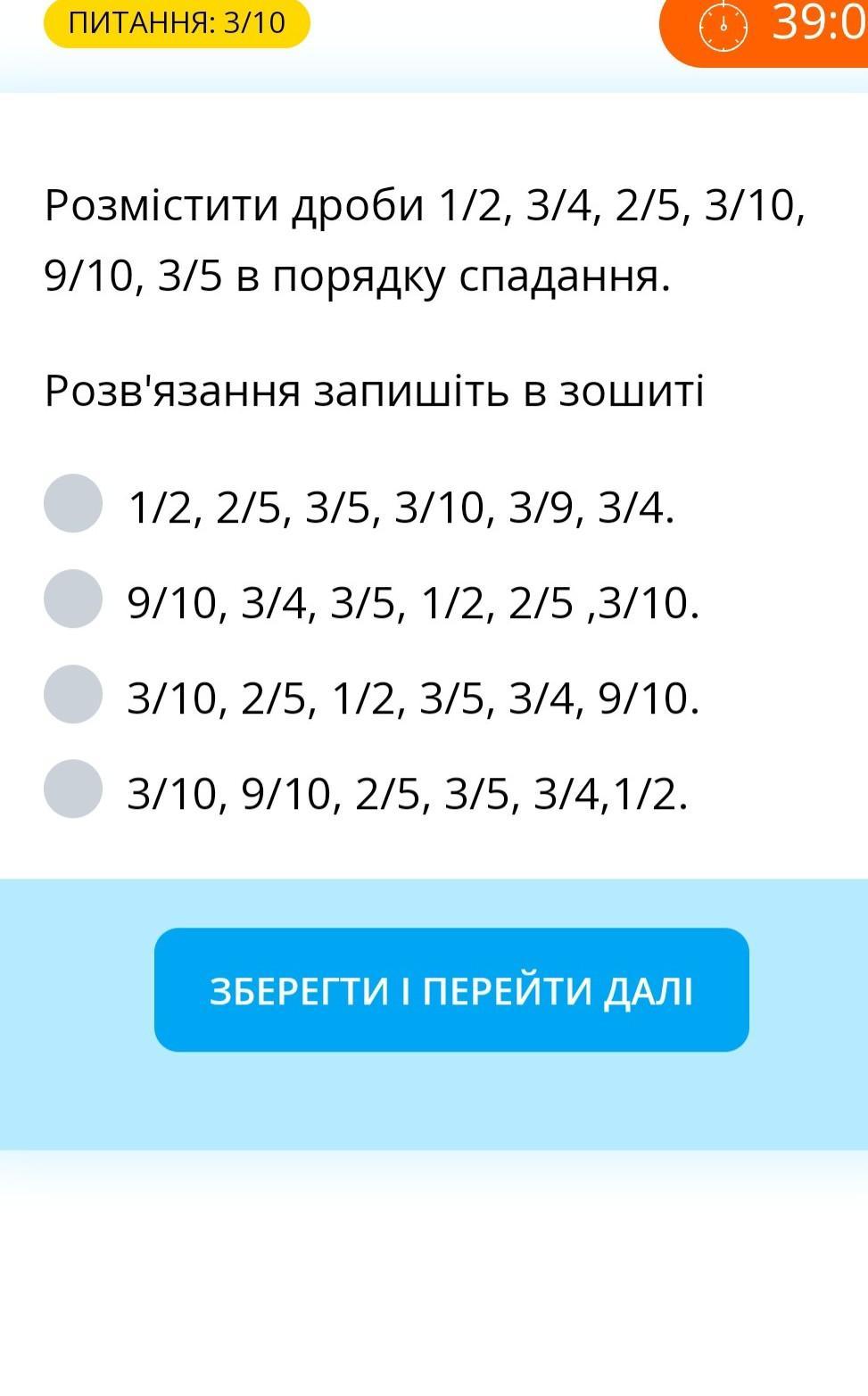 Розмістити дроби 1/2, 3/4, 2/5, 3/10, 9/10, 3/5 в порядку спадання. Розв'язання запишіть в зошиті 1/2, 2/5, 3/5, 3/10, 3/9, 3/4. 9/10, 3/4, 3/5, 1/2, 2/5,3/10. 3/10, 2/5, 1/2, 3/5, 3/4, 9/10. 3/10, 9/10, 2/5, 3/5, 3/4, 1/2.