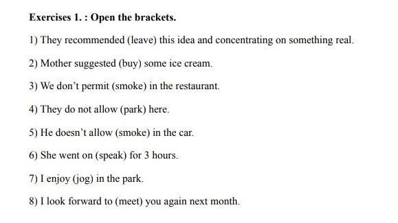 Exercises 1.: Open the brackets. 1) They recommended (leave) this idea and concentrating on something real. 2) Mother suggested (buy) some ice cream. 3) We don't permit (smoke) in the restaurant. 4) They do not allow (park) here. 5) He doesn't allow (smoke) in the car. 6) She went on (speak) for 3 hours. 7) I enjoy (jog) in the park. 8) I look forward to (meet) you again next month.