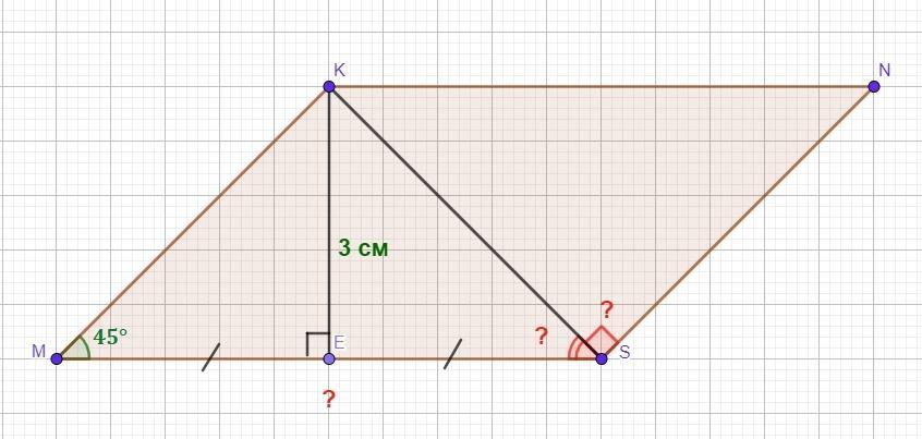 Дано: MKNS - параллелограмм, ∠М=45°, КЕ⊥MS, КЕ=3 см, МЕ=ЕS,