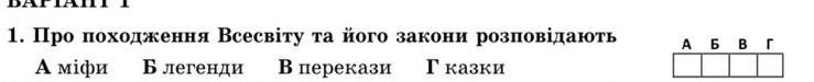 1. Про походження Всесвіту та його закони розповідають А міфи Б легенди В перекази Г казки А Б В Г