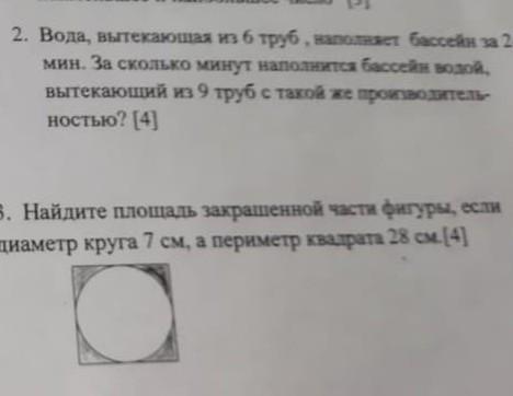 Найдите площадь закрашенной части фигуры, если диаметр круга 7 см, а периметр квадрата 28 см.