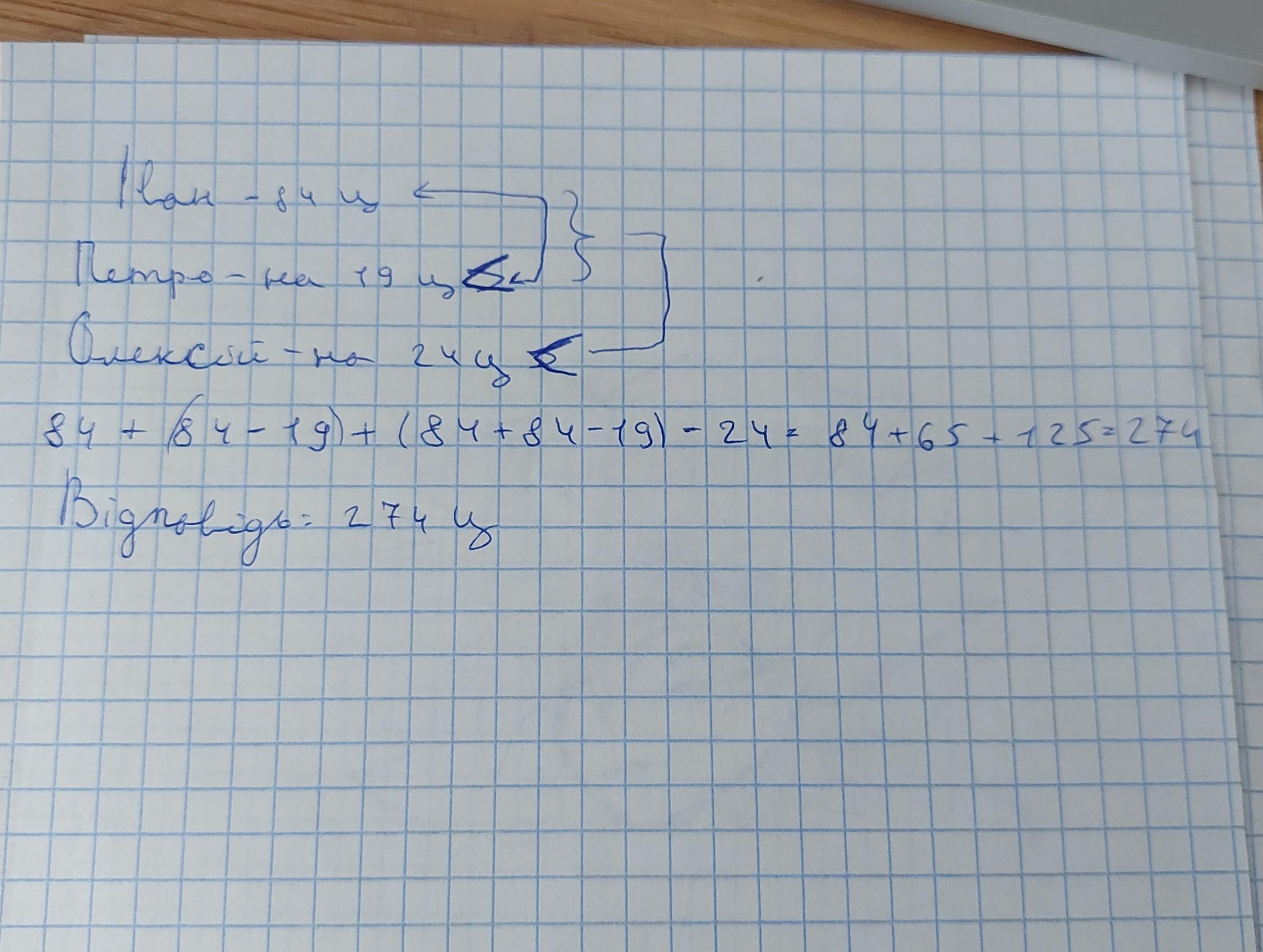 8. Іван, Петро і Олексій здали на завод цукрові буряки. Іван здав 84 ц, що на 19 ц більше ніж Петро. Разом вони здали на 24 ц бiльше, ніж Олексій. Скільки всього центнерів цукрових бурякiв вони здали?
