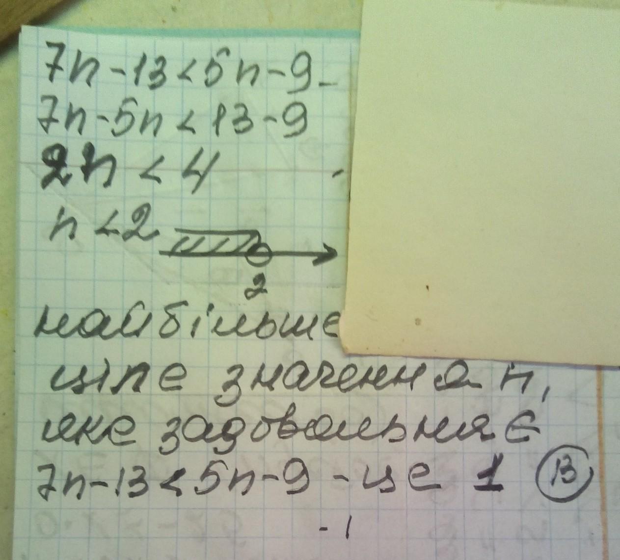 Яке найбільше ціле значення n задовольняє нерівність 7n-13≤5n-9?