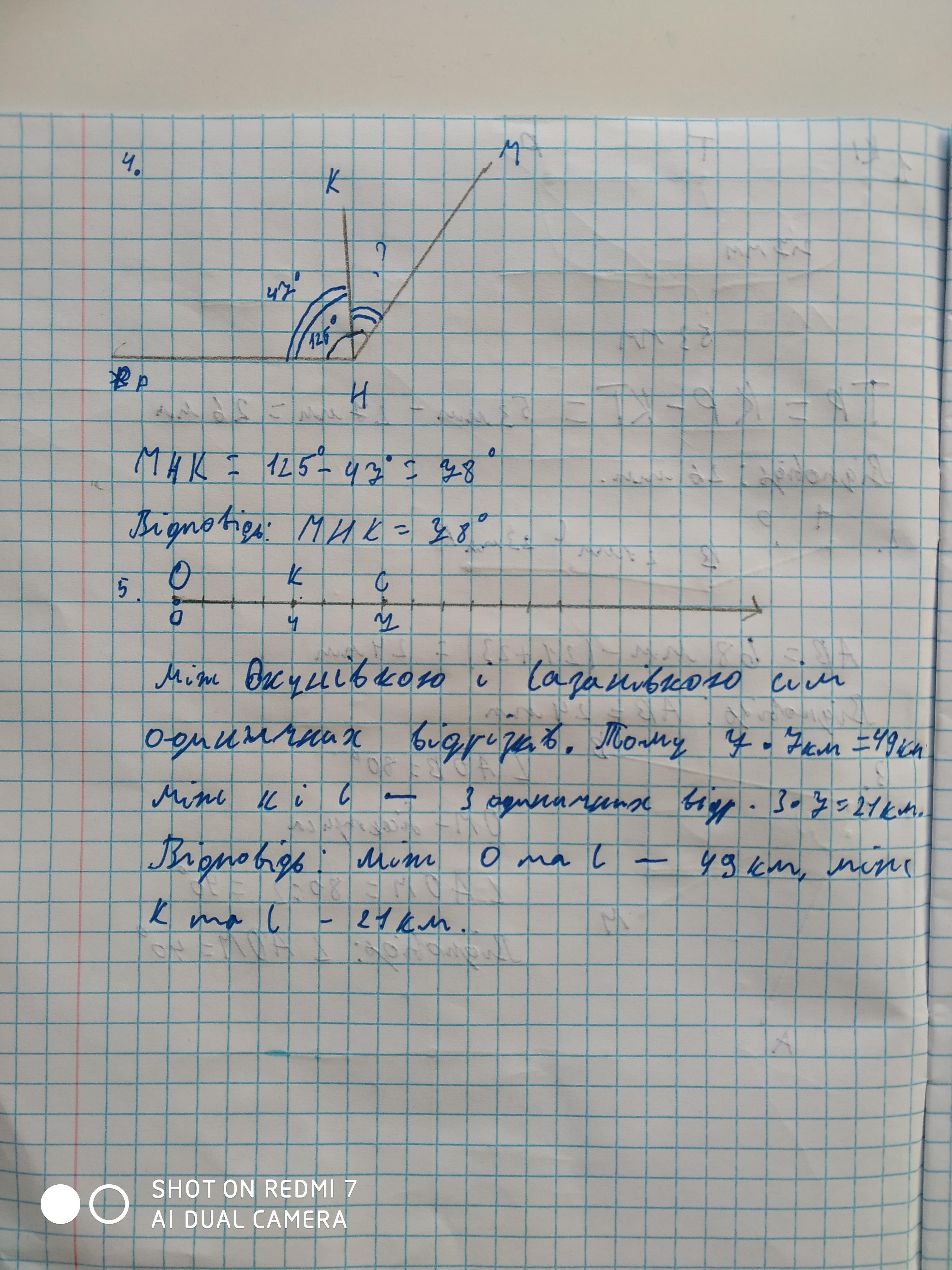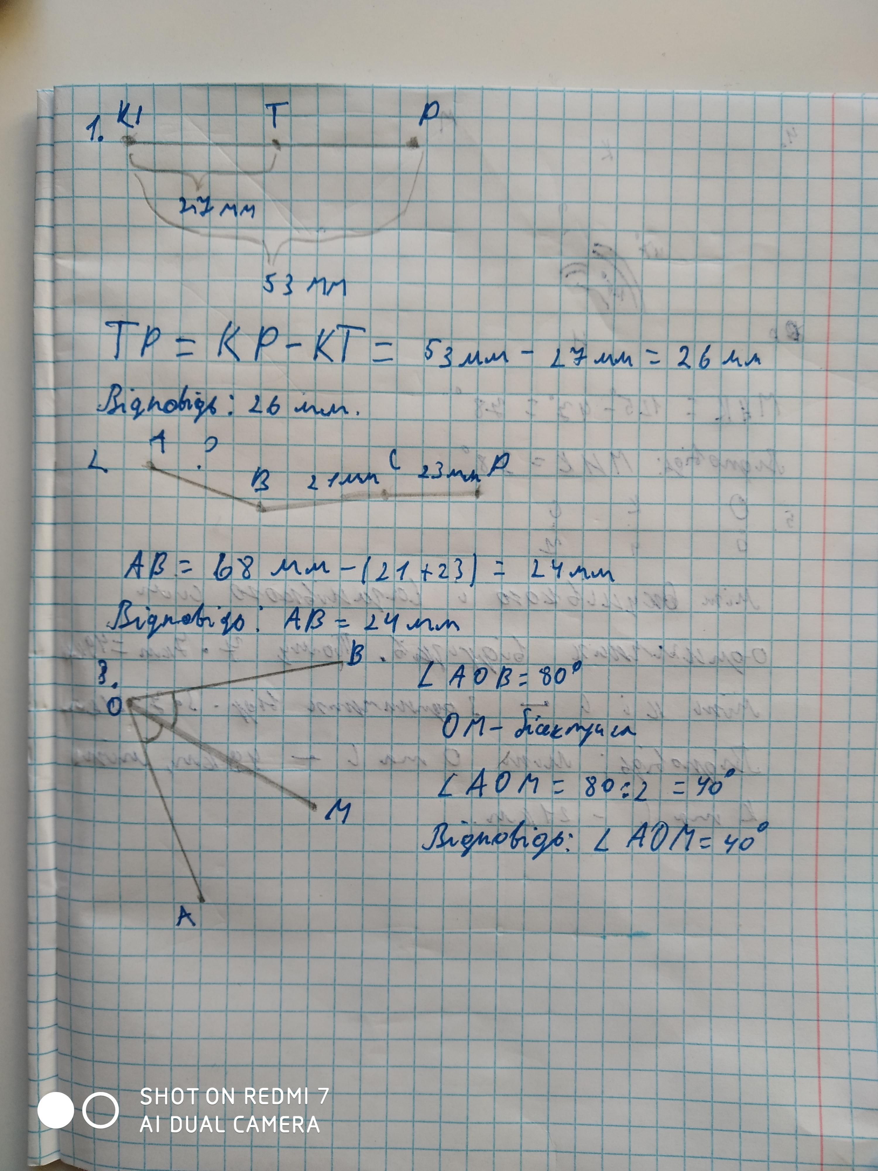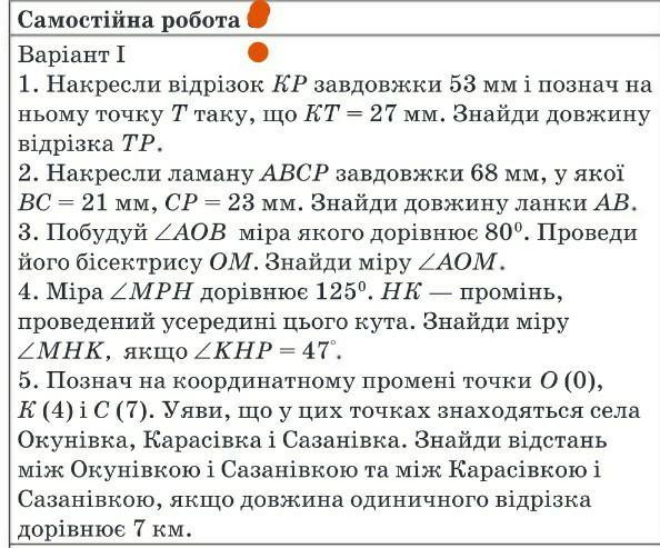 Самостійна робота Варіант I 1. Накресли вiдрiзок КР завдовжки 53 мм і познач на ньому точку Т таку, що КТ = 27 мм. Знайди довжину вiдрiзка TP. 2. Накресли ламану АВСР завдовжки 68 мм, у якої = ВС = 21 мм, СP = 23 мм. Знайди довжину ланки АВ. 3. Побудуй ZAOB мiра якого дорівнює 80º. Проведи його бісектрису ОМ. Знайди міру ZAOM. 4. Mipa ZMPH дорівнює 125°. НК - промінь, проведений усередині цього кута. Знайди міру ZMНК, якщо /КНР = 47°. 5. Познач на координатному промені точки О (0), К (4) і С (7). Уяви, що у цих точках знаходяться села Окунівка, Карасівка і Сазанівка. Знайди відстань між Окунівкою і Сазанівкою та між Карасівкою і Сазанівкою, якщо довжина одиничного відрізка дорівнює 7 км.