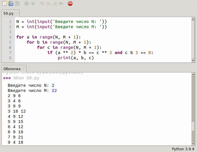Знайти всі натуральні числа a, b i c з інтервалу вiд N до M, для яких виконується Рiвнiсть:a²b=c² і якщо с кратне 3. Python