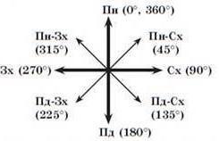 Б)90°-схід, 180°південь, 270°захід, 315°північний захід