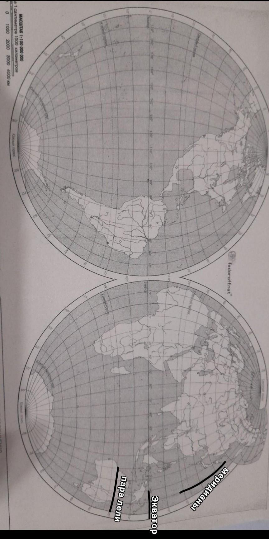2. Обозначьте на контурной карте мира экватор, меридианы и парал- лели. Найдите на карте территорию Казахстана и выделите гра- ницы республики красным цветом. Отметьте красным кружочком местоположение Астаны и подпишите название.