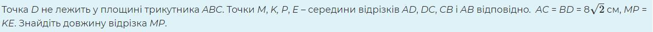 Точка D не лежить у площині трикутника ABC. Точки M, K, P, E – середини відрізків AD, DC, CB і AB відповідно. AC = BD = 8√2 см, MP = KE. Знайдіть довжину відрізка MP.