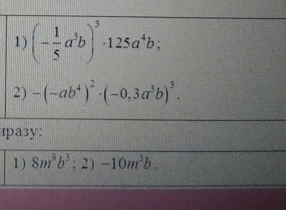 1) (-⅕ а³b)³• 125а⁴b= −15,625a⁹b³•125a⁴b=−1953,125 a¹³b⁴