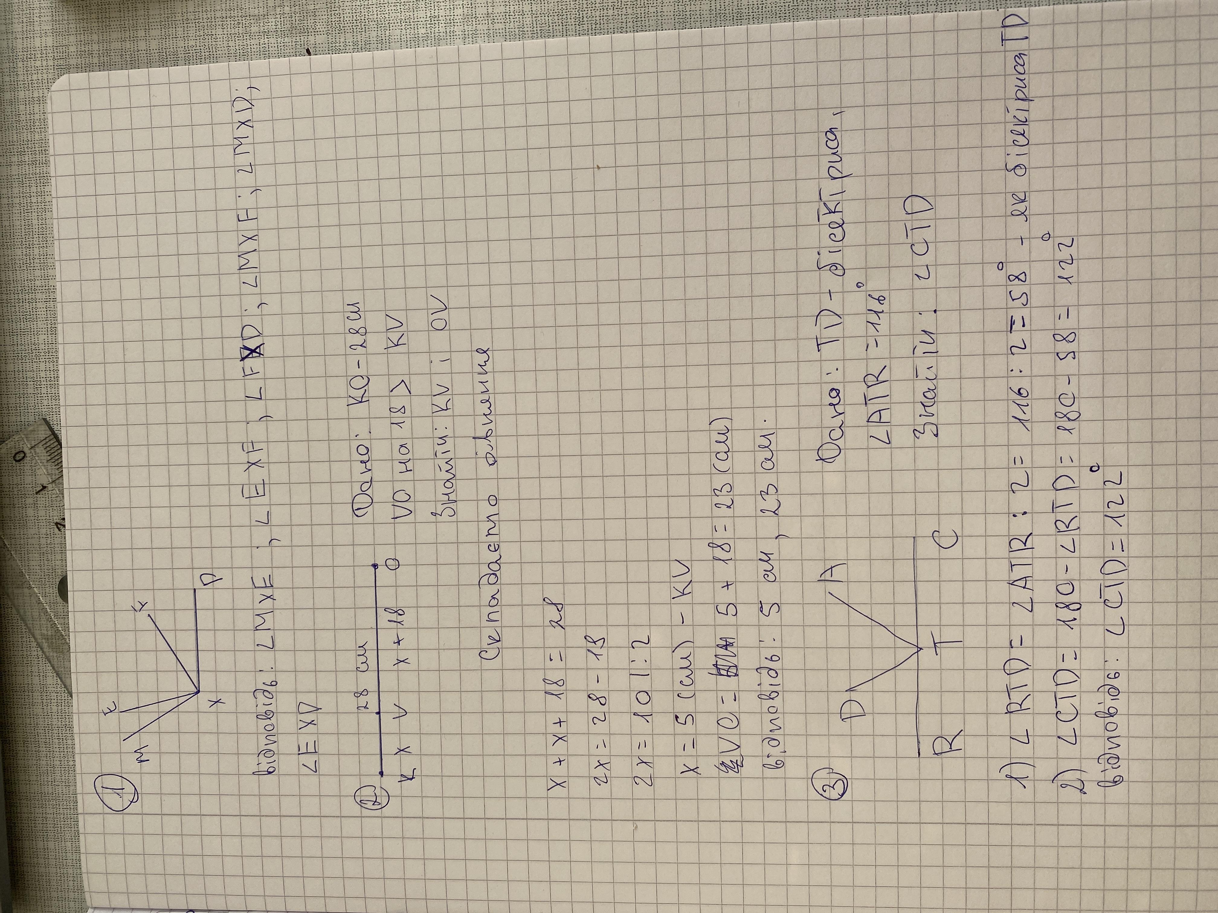 Накресліть кут MXD та проведіть промені ХЕ і ХР між його сторонами. Запишіть усі кути, що утворилися. ** Э Точка V належить відрізку КО, довжина якого дорів- нюе 28 см. Знайдіть довжини відрізків КV і VO, якщо: відрізок VO на 18 см більший за відрізок KV; бісектриса кута ATR. На рисунку 211 промінь TD Знайдіть кут CTD, якщо ZATR=116°. A R T C Рис. 211