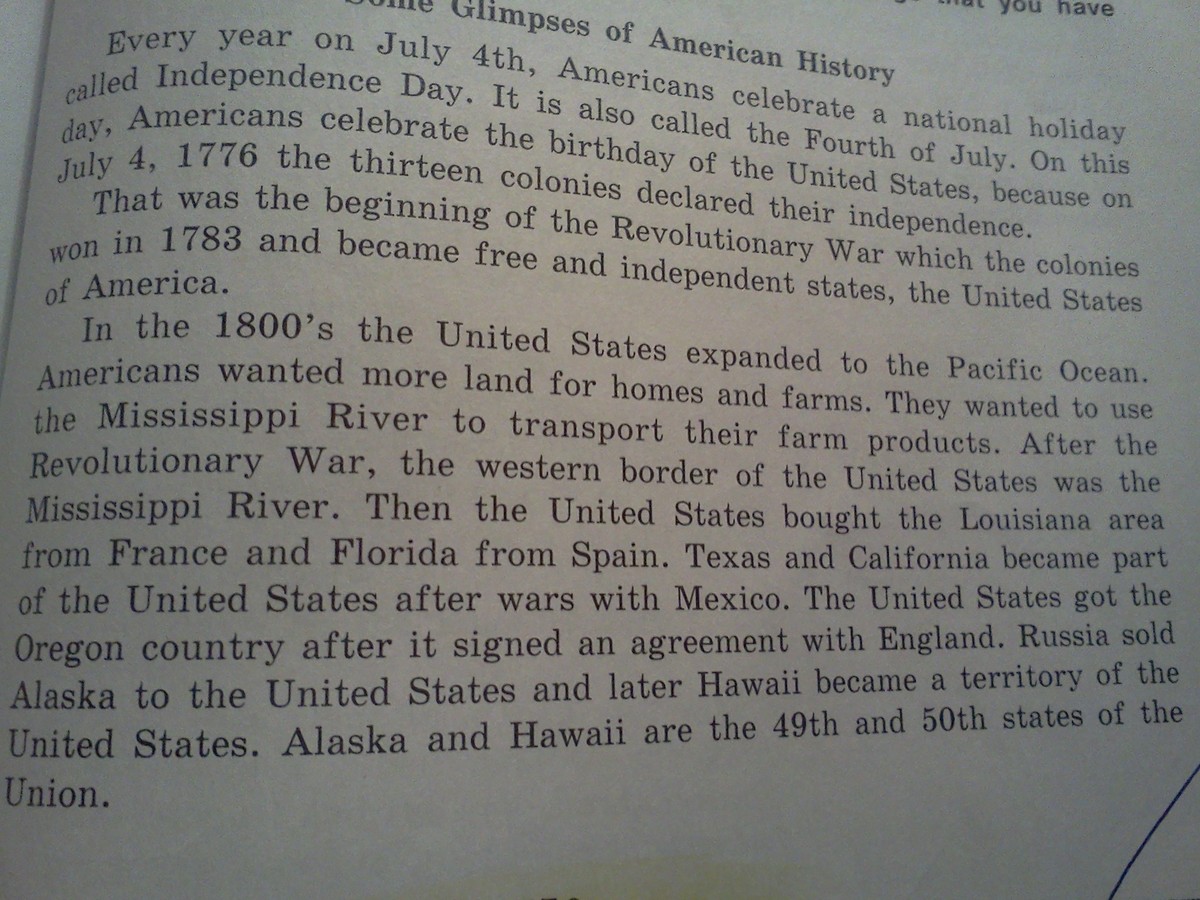 В 1800 Соед.штаты расширились к тихому океану.Америка хотела больше земли для домов и ферм.Они хотели использовать реку Мисисипи чтобы перевозить продукты с фермы(дословно).После революционной войны,западной границей Соед.штатов являлась река Миссисипи .После Соед.шт. купили участок Луизиана(дословно) у Франции и Флориду у Испании.Техас и Калифорния стали частью Соед.штат.после войны с Мексикой.Россия продала Аляску Соед.штат. и позже Гаваи станут территорией Соед.штат.Аляска и Гаваи являются 49 и 50 штатами союза.
