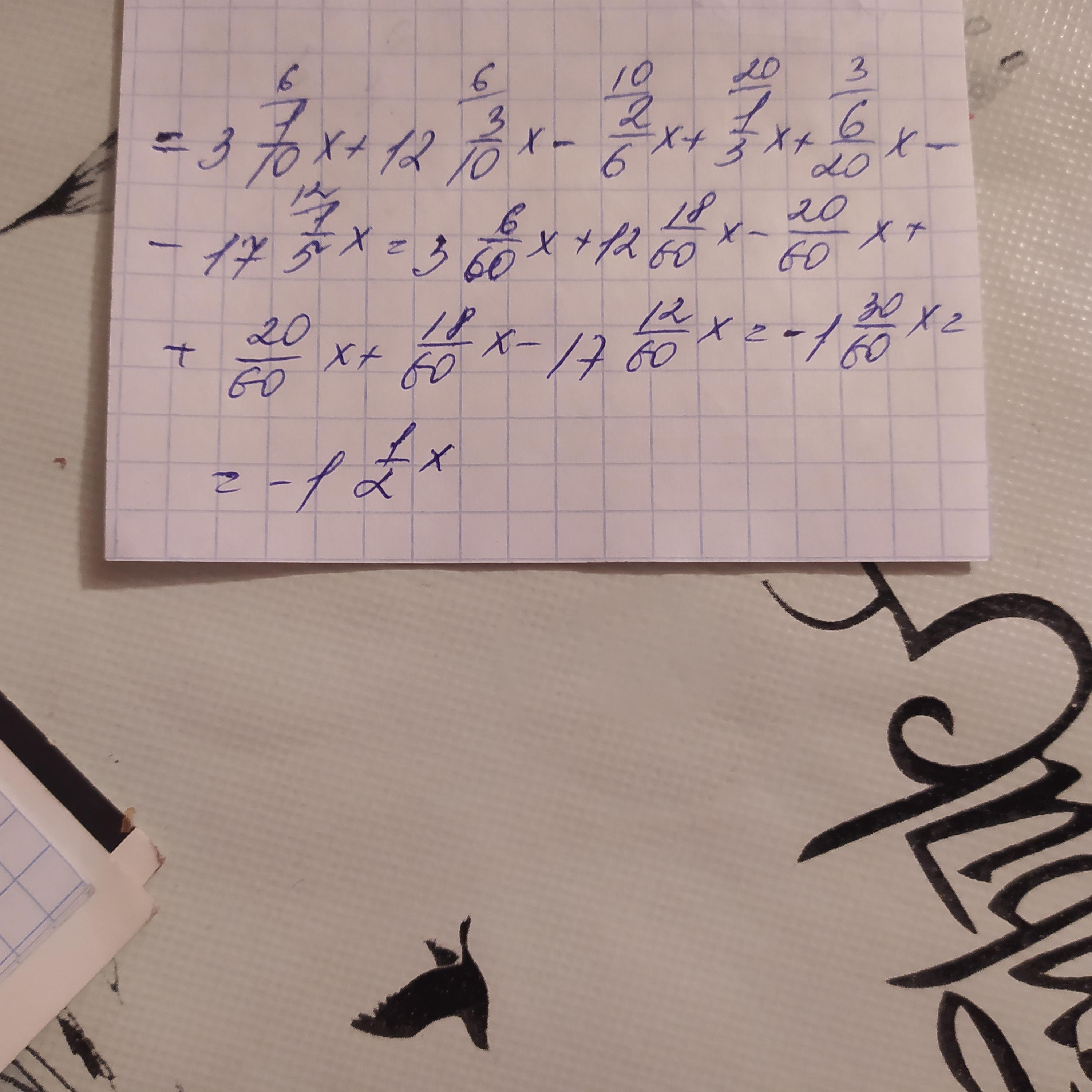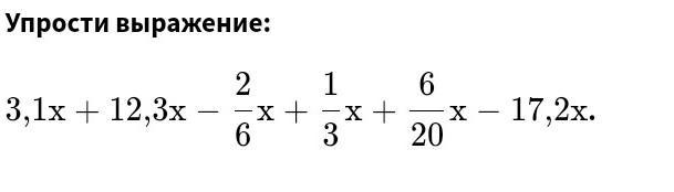 Упрости выражение: 3,1x+12,3x-2/6x+1/3x+6/20x-17,2x
