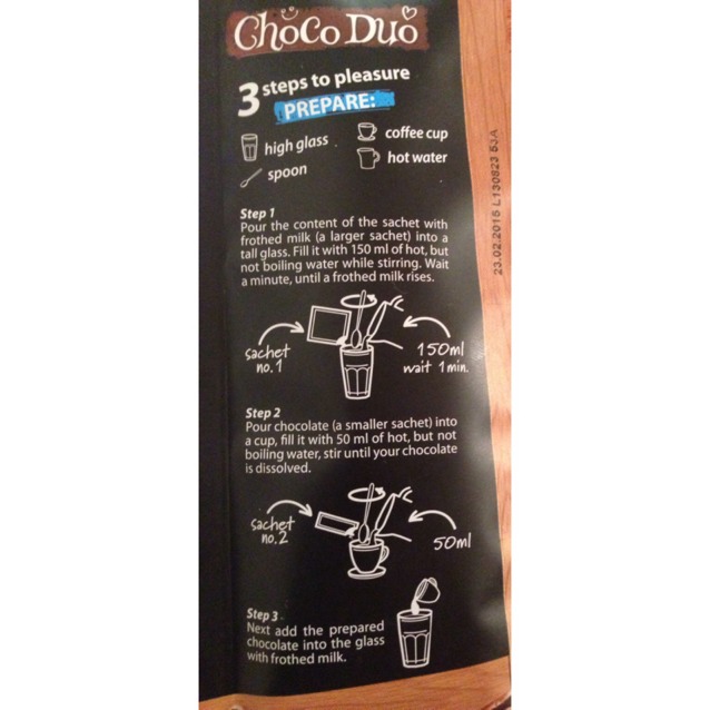 Высыпьте содержимое пакетика с сухим молоком (бо́льший пакетик) в небольшой стакан. Залейте 150 миллилитрами горячей, но не кипячёной (имеется в виду не только что закипевшей, а слегка остывшей) воды перемешивая. Дождитесь, когда молоко вспенится.