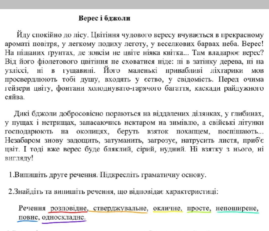 Ответ: йду спокійно по лісу - не поширене ; ні взяьку з нього ні вигляду! - окличне; і тоді верес буде бляклий сірий і нудний- стверджувальне; дикі бджоли...- повне;його маленькі...-односкладне вроді