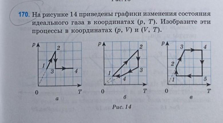 На рисунке 14 приведены графики изменения состояния идеального газа в координатах p,T; изобразите эти процессы в координатах p,V; V,T;