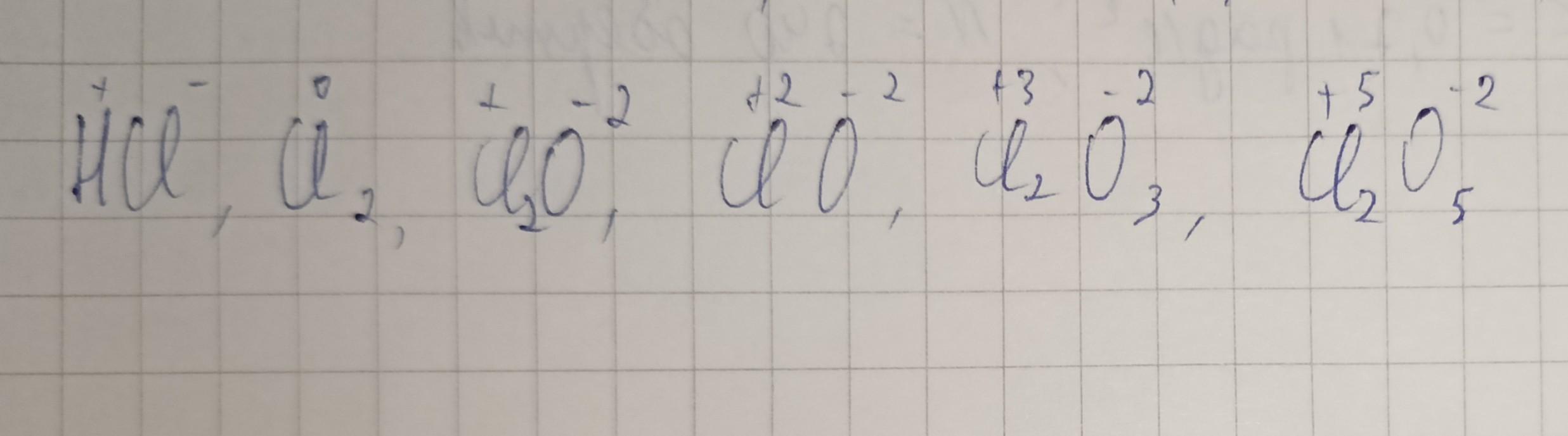 Визначте електронну формулу Хлору в ступенях окиснення: –1; 0; +1; +3; +5; +17. Складіть молекулярні та графічні формули відповідних сполук. Визначте масові частки елементів в цих сполуках.