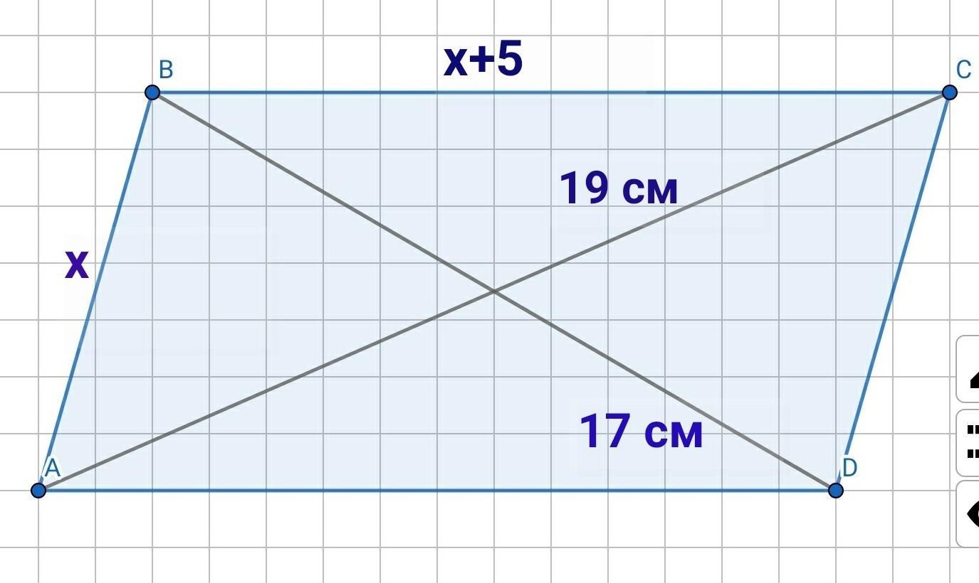 Дано: ABCD - паралелограм, ВС>АВ на 5 см, АС=19 см, BD= 17 см