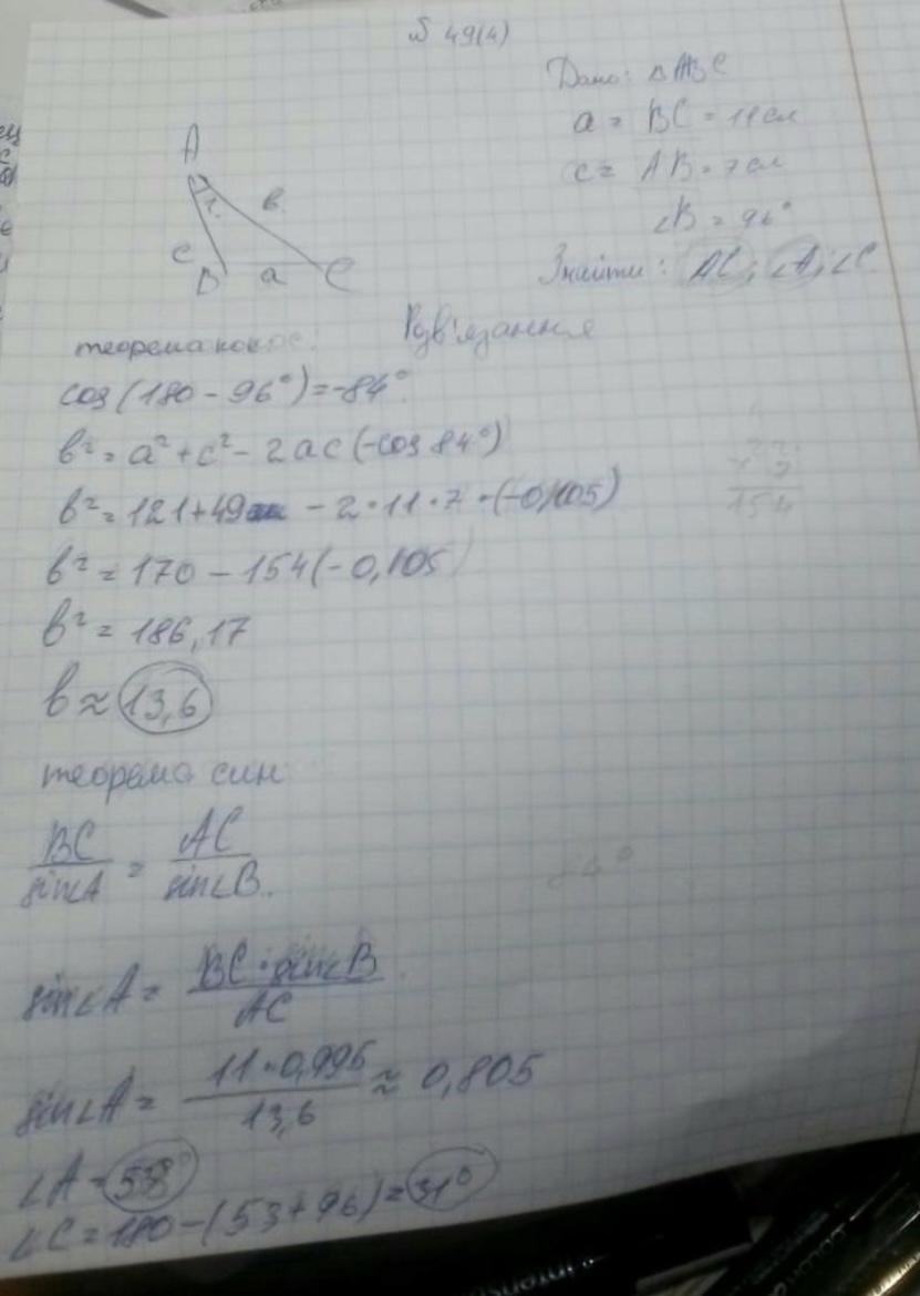 СРОЧНО Розв'яжіть трикутник ABC за двома сторонами та кутом між ними: AB = 7 см, CB= 11 см, <B=96 градусов
