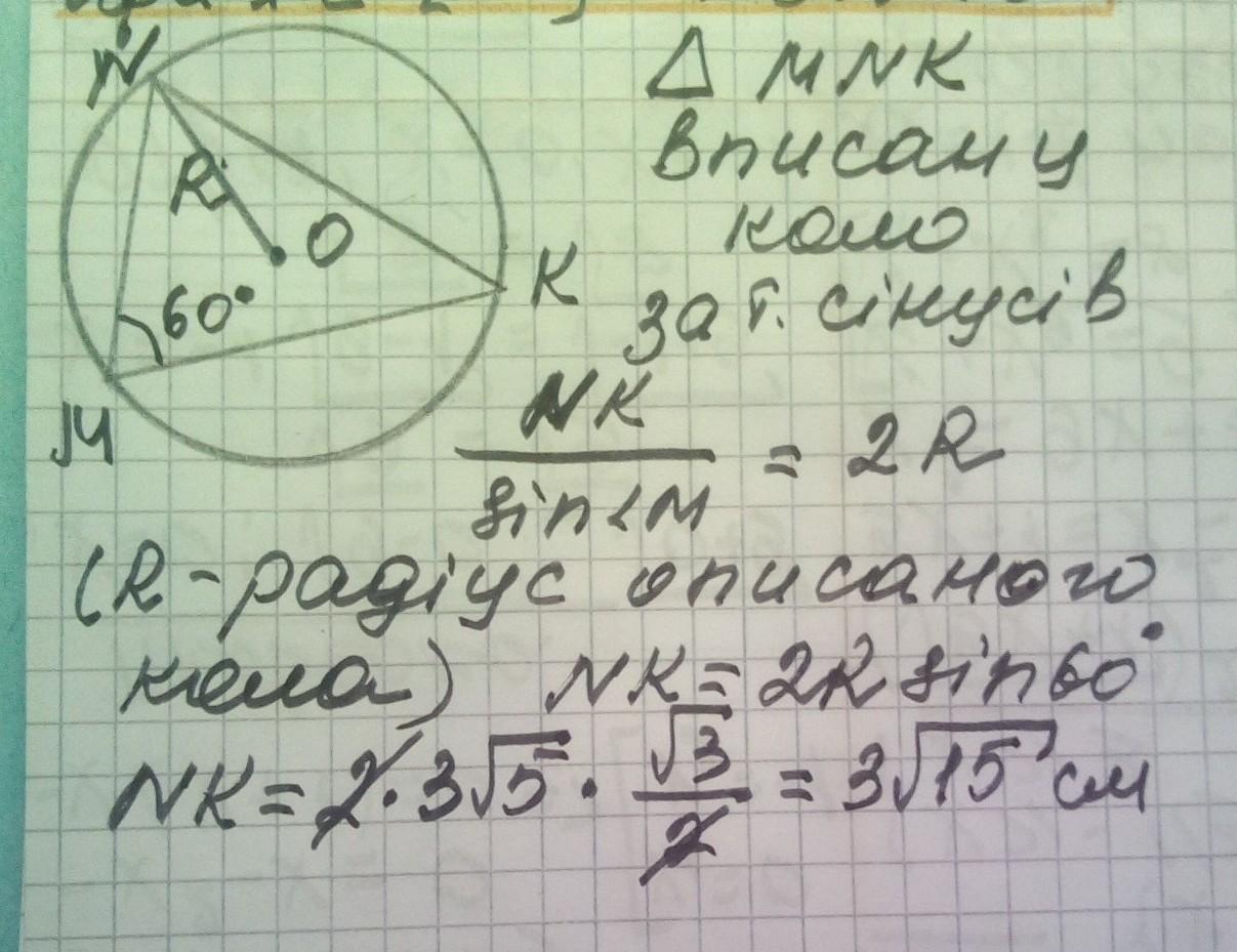 Навколо трикутника MNK описано коло, радиус якого доривнюе 3квадратний корень 5 см знайдить сторону NK якщо кут M =60 градусив