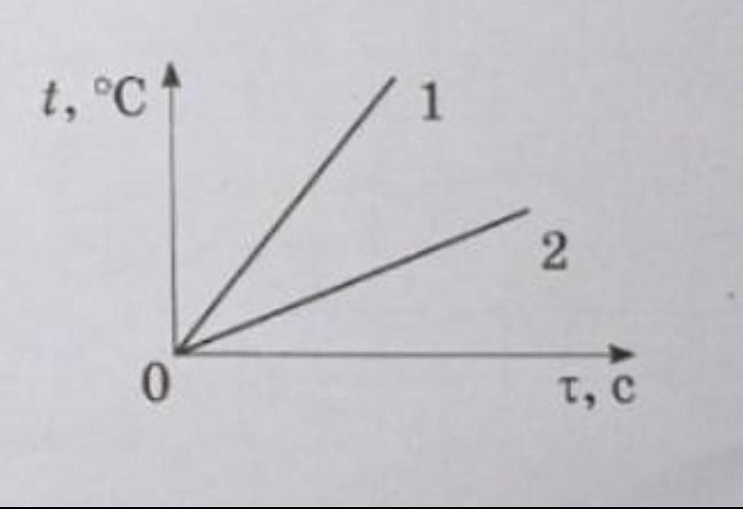 Алюминий имеет теплоёмкость ≈ 900Дж/кг*С°. У железа, согласно данным, она равна 460 Дж/кг*С°. Следовательно, чтобы нагреть алюминий, требуется куда больше теплоты, нежели для нагревания железа. Поэтому более плавный график 2 соответствует алюминию, а более резкий 1 - железу.