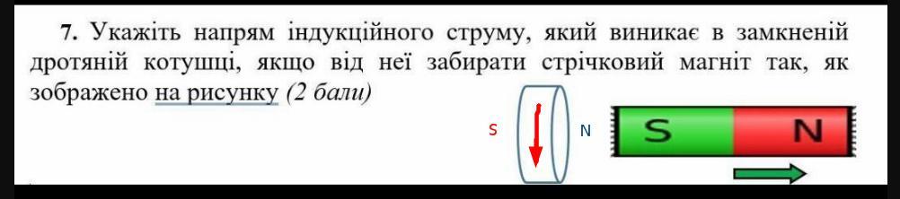 Пояснення: за правилом Ленца при віддалені від котушки південного полюса магніту на боці котушки до повернутій до південного полюса магніту виникає північний полюс. Знаючи полюси котушки за правилом правої руки визначаємо напрям струму.