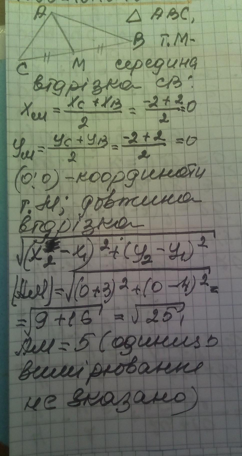 Знайдіть довжину медіани АМ трикутника АВС, якщо А(-3;4), В(2;2), С(- 2;- 2)