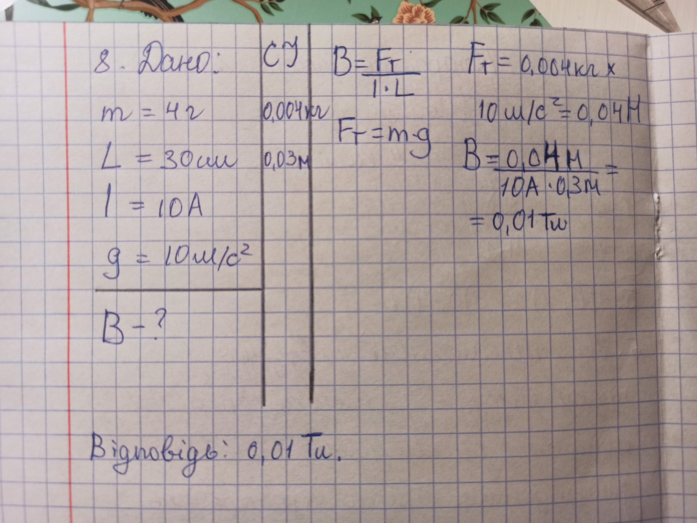 Сила струму в горизонтально розташованому провіднику, довжина якого 30см, а маса 4г, становить 10А. Визначте індукцію магнітного поля, у яке слід помістити провідник, щоб сила тяжіння зрівноважила силу Ампера. Лінії магнітної індукції є горизонтальними та перпендикулярними до провідника. Вважайте, що g=10 м/с2.