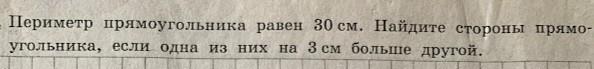 Периметр прямоугольника P=2(a+b)=30 см, где b=a+3 тогда