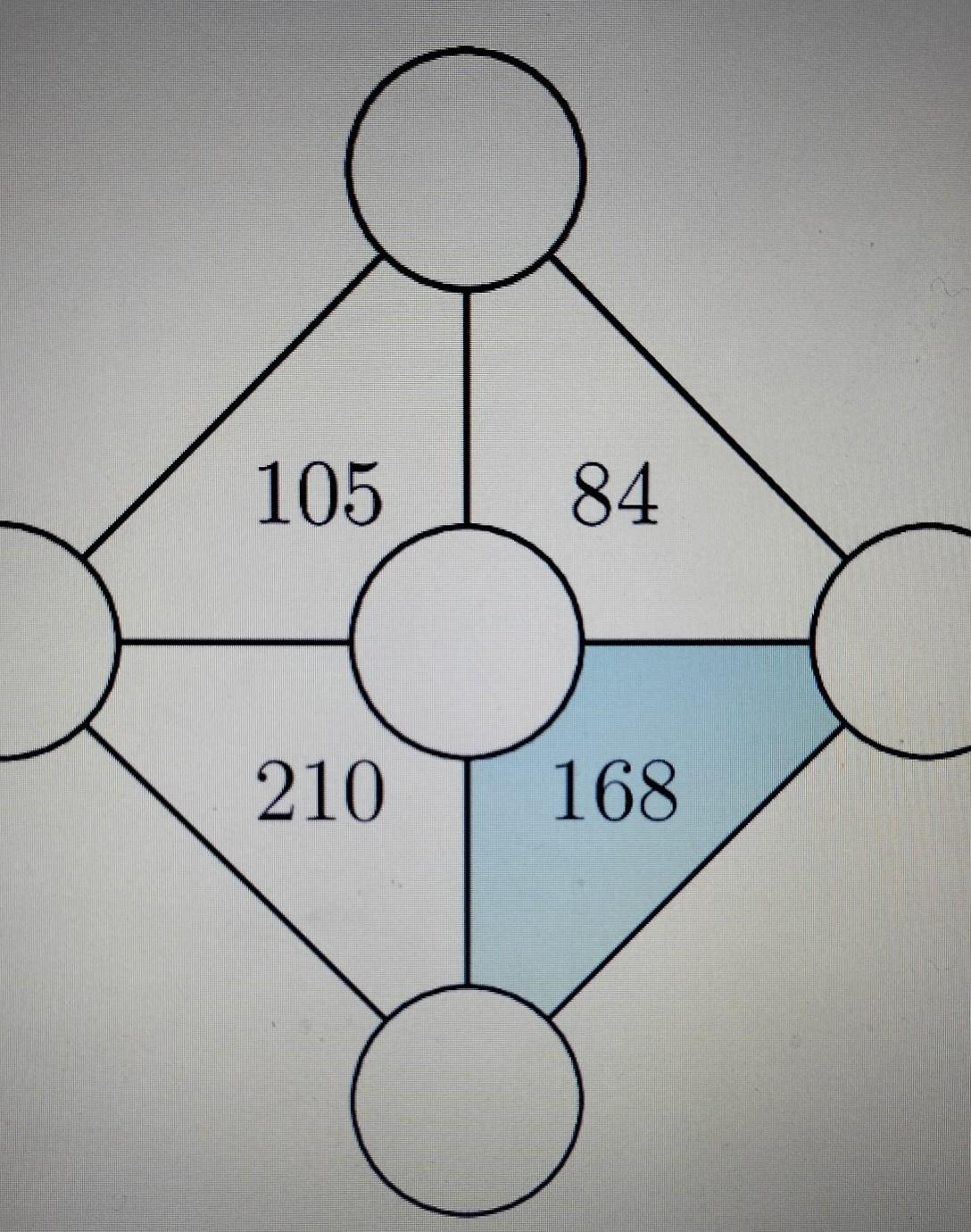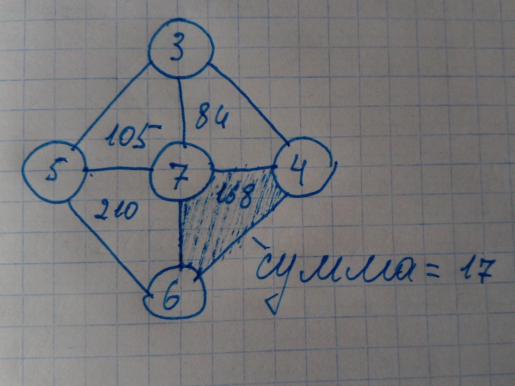 Числа 3,4,5,6,7 размещены в пять круга так, чтобы внутри каждого треугольника написано произведение чисел, расположенных на ее вершинах. Какова сумма трех чисел на вершинах закрашенного треугольника?