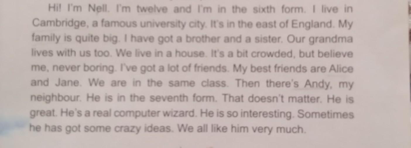 Nell is twelve.She's in sixth form.She lives in Cambridge,a famous university city which is in the east of England.Her family is quite big.She has got a brother and a sister.Her grandma lives with them too.Their house is a bit crowded but never boring.Her best friends are Alice and Jane and they in the same class with her.His neighbour Andy is in seventh form.He's a computer wizard.Nell describes him as an interesting,great person who sometimes has got crazy ideas.She also says that everyone likes him very much.