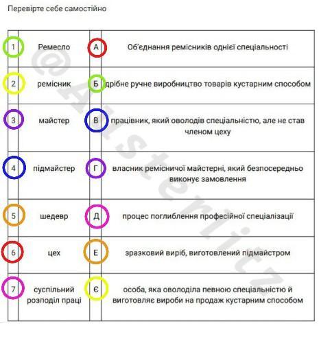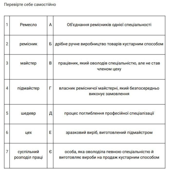 1Б; 2Є; 3Г; 4В; 5Е; 6А; 7Д.