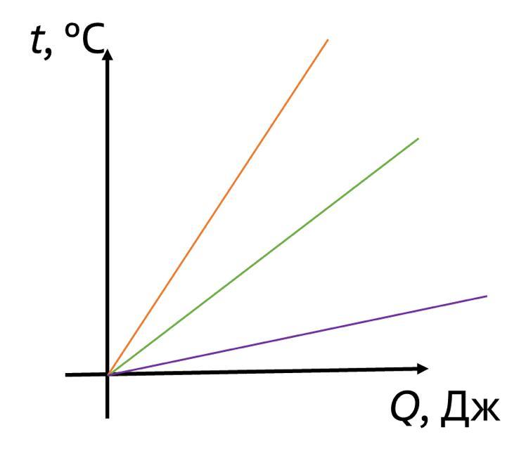 Теперь думаем. При одинаковом количестве теплоты оранжевый нагрелся больше всего - наименьшая масса у него.