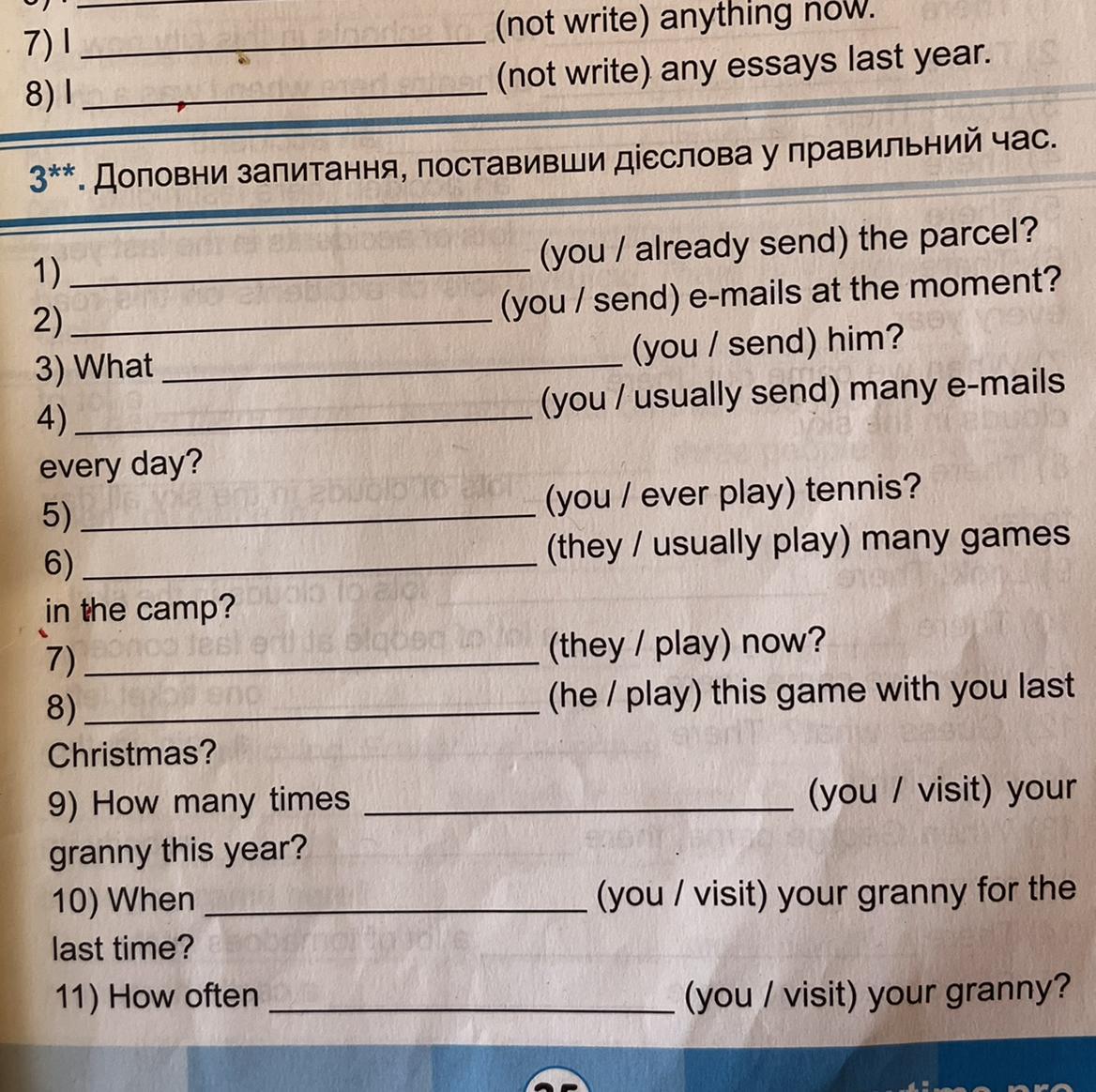 Объяснение: 1. Have you already sent 2. Are you sending..3. did you send4. Do you usually send 5. Have you ever played ? 6 Do you usually7. Are they playing