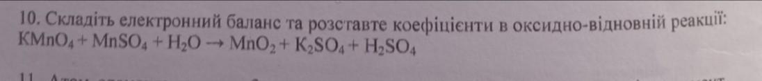 Складіть електронний баланс та розставте коефіцієнти в оксидно-відновній реакції: KMnO_{4} + MnSO_{4} + H_{2}O → MnO_{2} + K_{2}SО_{4} + Н_{2}SO_{4}
