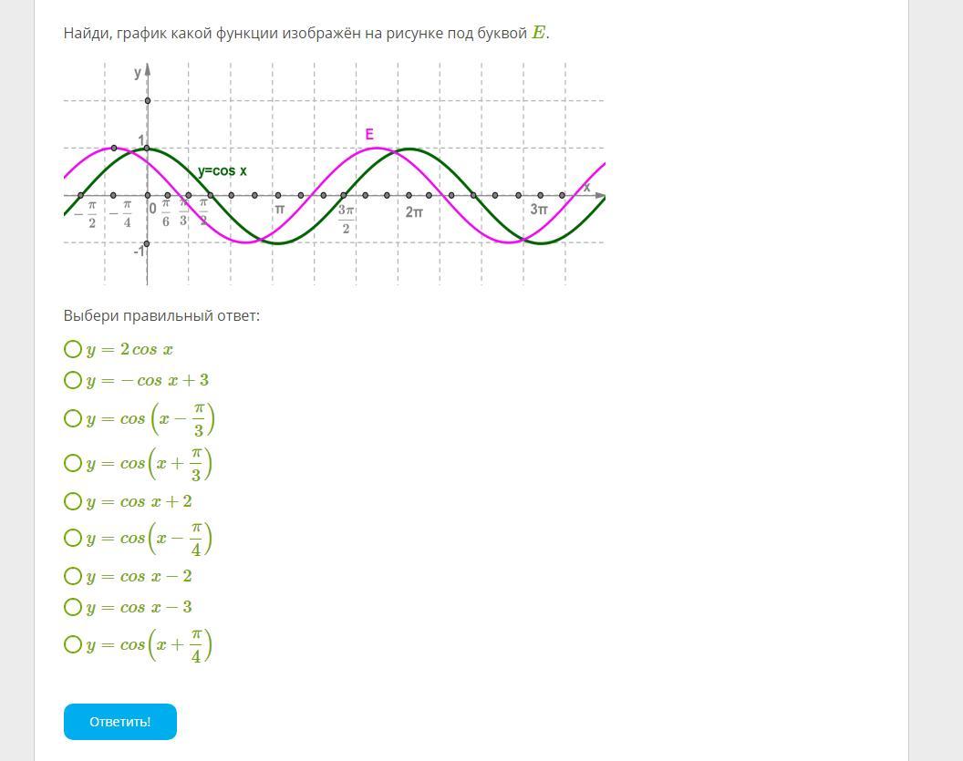 Смотрим на график зелёный у=cosx. График Е сдвинут на π/4 влево. Значит это у=cos(x+π/4).