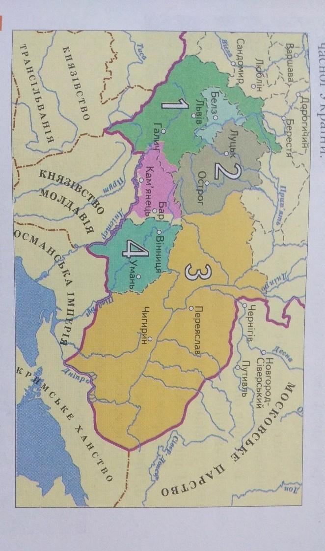 Розгляньте карту. Запишіть у зошит назви позначених цифрами воєводств Речі Посполитої, які розташовувалися на території сучасної України.
