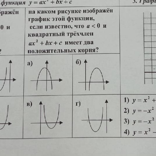 На каком рисунке изображён график этой функции, если известно, что а < 0 и квадратный трёхчлен имеет два положительных корня?