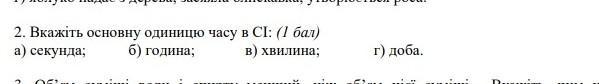 2. Вкажіть основну одиницю часу в СI: (1 бал) a) ceкунда; б) година; в) хвилина; г) доба.