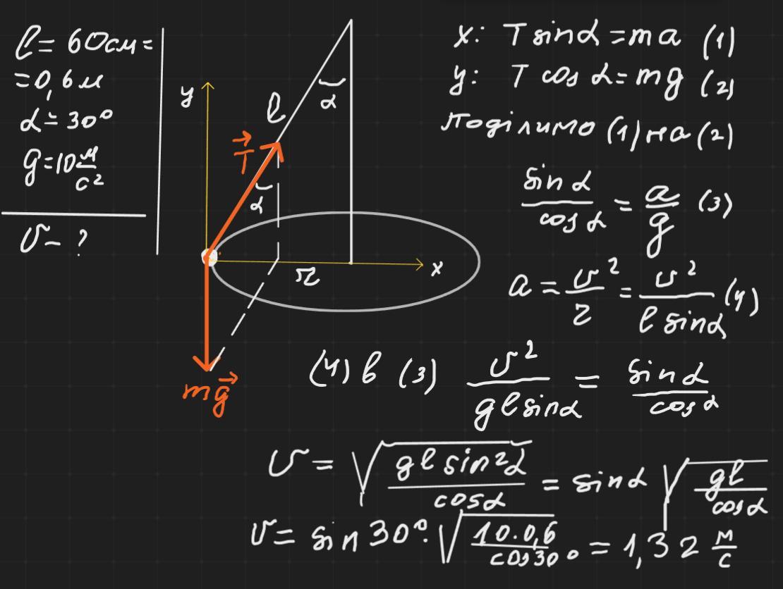 Вантаж,який підвісили на нитці завдовжки 60см,описує в горизонтальній площині коло.З якою швидкістю рухається вантаж,якщо під час його руху нитка утворює з вертикаллю кут 30°?