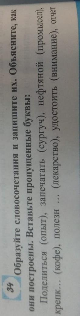 34.Образуйте словосочетания и запишите их. Объясните, как они построены. Вставьте пропущенные буквы: Поделиться (опыт), запечатать (сургуч), нефтяной (промысел), крепк... (кофе), полезн (лекарство), удостоить (внимание)