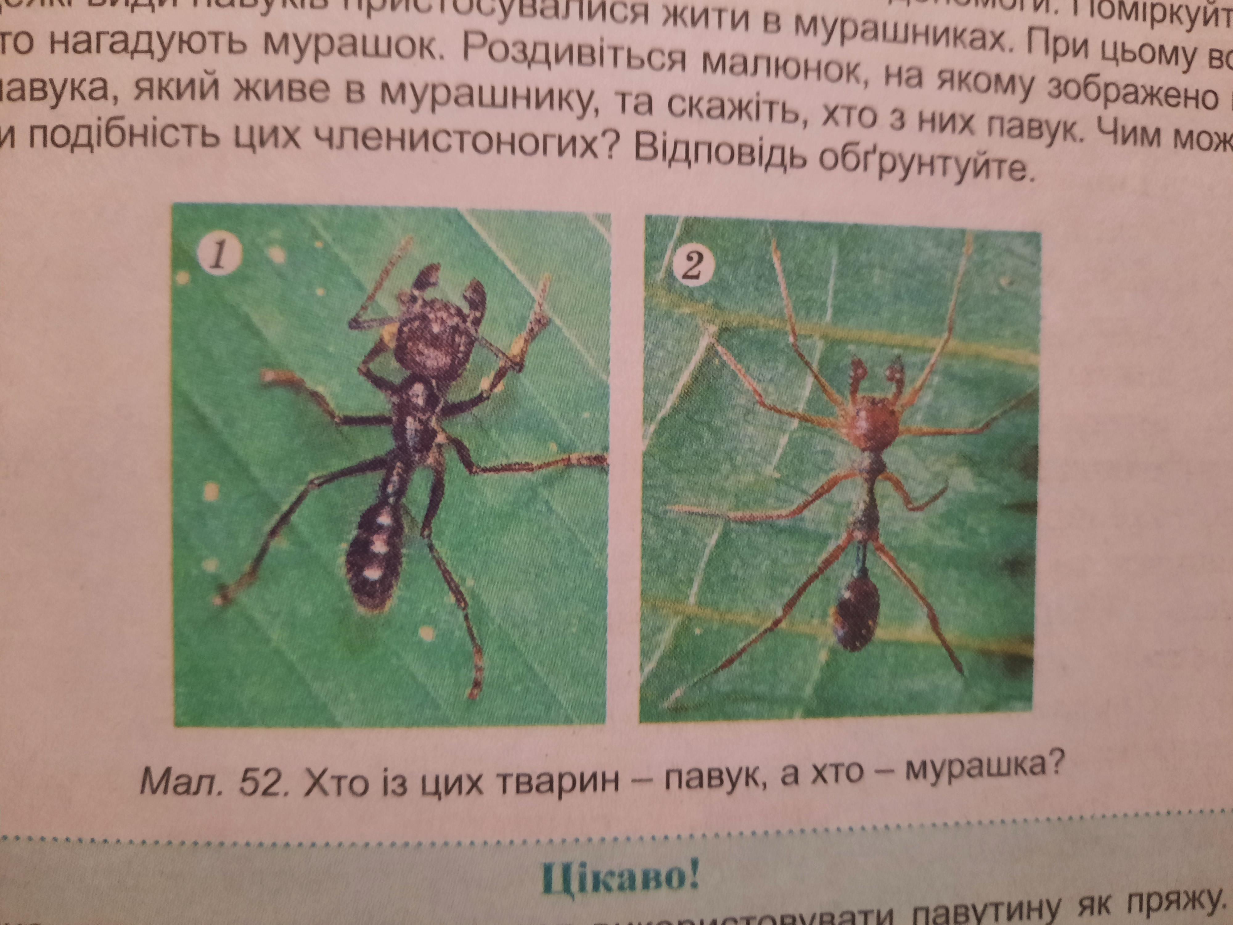 Деякі види павуків пристосувалися жити в мурашниках . При цьому вони зовні часто нагадуюсь мурашок . Роздивіться малюнок , на якому зображено мурашку та павука, який живе в мурашнику , та скажіть , хто з них павук . Чим можна пояснити подібність цих членистоногих ? Відповідь обгрунтуйте.