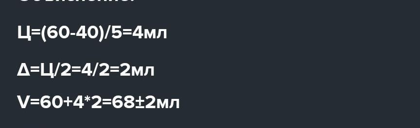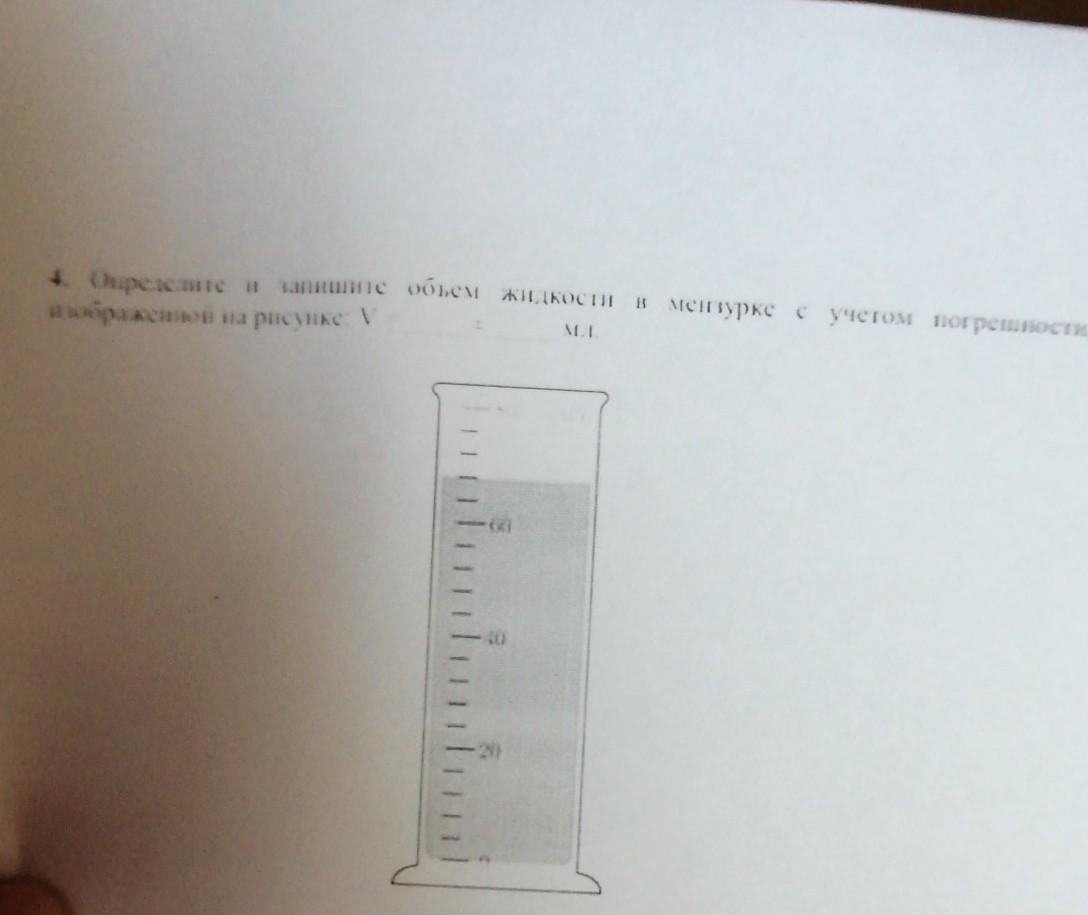 4. Определите и запишите обьем жидкости в мензурке с учетом погрешности, изображенной на рисунке
