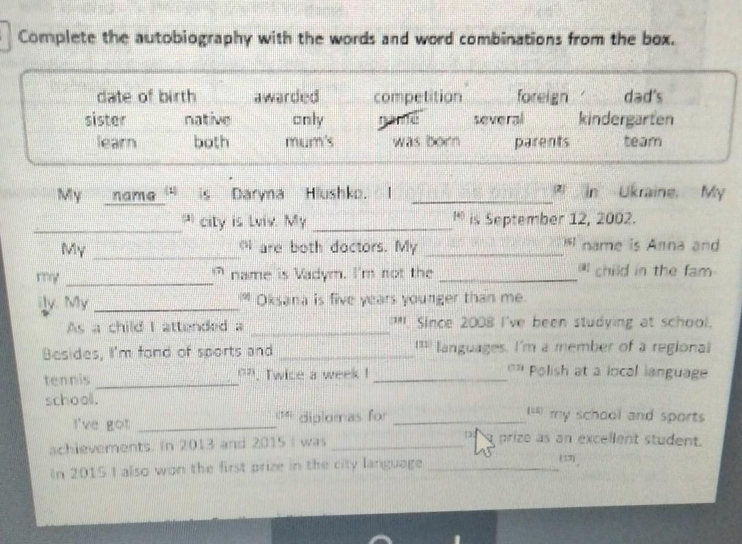 I was born in Ukraine. My native city is a Lviv. My date of birth is September 12, 2022. My parents are both doctors. My mom's name is Anna and my dad's name is Vadim. I'm not the only child in family. My sister Oksana is five years younger than me. As a child i attented a kindergarden. Since 2008 i've been studying at school. Besides, i'm fond a sport and foreign languages. I'm a member of a regional tennis team. Twice a week i learn Polish at a local language school. I've got awarded diplomas for competition my school and sports achievements in 2013 and 2015 i was awarded a prize as a excellent student. In 2015 i'm also won the first prize in the city language competition.
