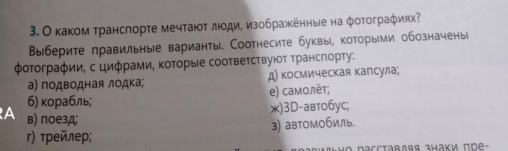 3. О каком транспорте мечтают люди, изображённые на фотографиях? Выберите правильные варианты. Соотнесите буквы, которыми обозначены фотографии, с цифрами, которые соответствуют транспорту: а) подводная лодка; б) корабль; в) поезд; д) космическая капсула; е) самолёт; ж)3D-автобус; 3) автомобиль. г) трейлер;. ПОМОГИТЕЕЕЕЕЕ НУЖНО К ПОНИДЕЛЬНИКУ