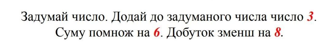 Задумай число. Додай до задуманого числа число 3. Суму помнож на 6. Добуток зменш на 8.
