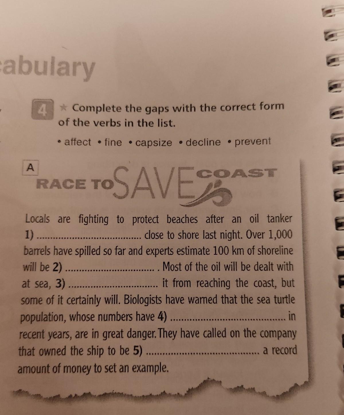 A * Complete the gaps with the correct form of the verbs in the list. affect fine capsize decline prevent ● TO SAVE RACE TO COAST Locals are fighting to protect beaches after an oil tanker 1) .......... close to shore last night. Over 1,000 barrels have spilled so far and experts estimate 100 km of shoreline will be 2) .......... Most of the oil will be dealt with it from reaching the coast, but at sea, 3) ........... some of it certainly will. Biologists have warned that the sea turtle population, whose numbers have 4) ....... in recent years, are in great danger. They have called on the company that owned the ship to be 5) ...... a record amount of money to set an example.